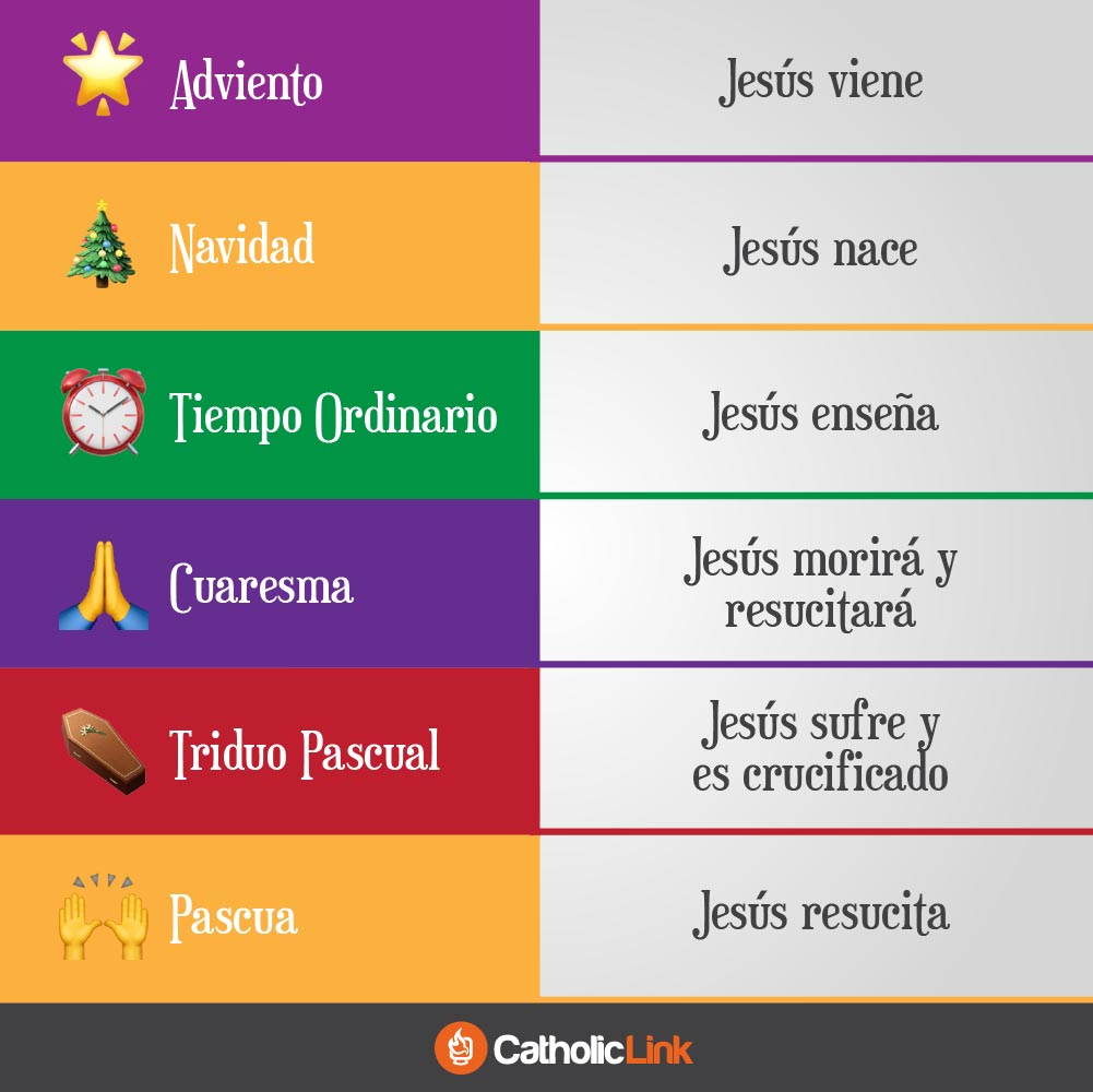 Cuaresma: Comienza el Miércoles de Ceniza y finaliza al inicio del Triduo Pascual, el Jueves Santo. Fuerte tiempo de conversión y penitencia, ayuno, limosna y oración. Es un tiempo de 5 semanas cuando nos preparamos para la Pascua. No se dice “Aleluya”, no se colocan flores en la iglesia, no se utilizan muchos instrumentos y no se canta el Himno de Alabanza. Es un tiempo de sacrificio y penitencia, no de alabanza.